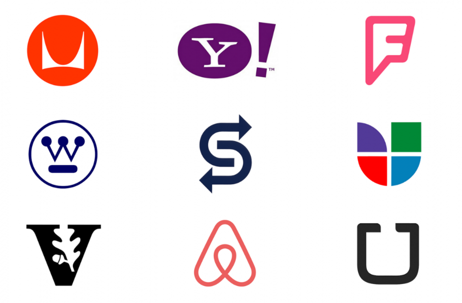 字體徽標的示例包括:摩托羅拉、雅虎、FourSquare、西屋、SeaTrain Lines、Univision、范德比爾特大學(xué)、AirBnB 和 Uber。